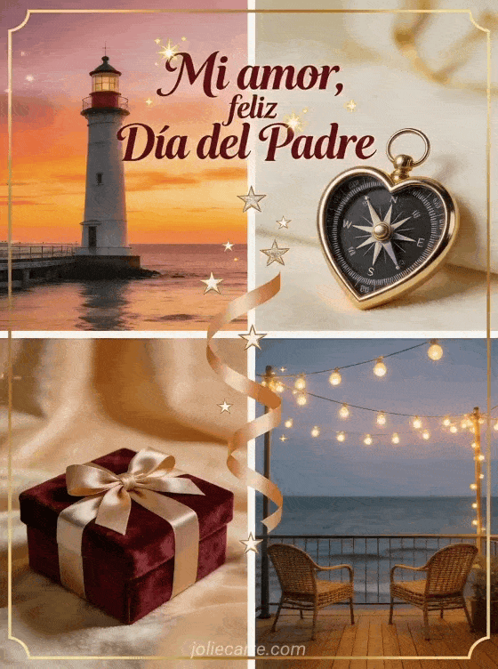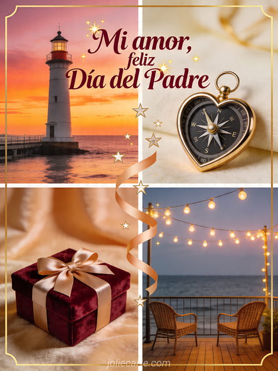 Envíen un saludo romántico de feliz Día del Padre amor mío en un collage cálido con un faro al atardecer, una brújula con forma de corazón, una caja de regalo de terciopelo y luces en una terraza junto al mar. Vean también una imagen gratuita Día del Padre, una tarjeta feliz Día del Padre o feliz día del padre mi amor.