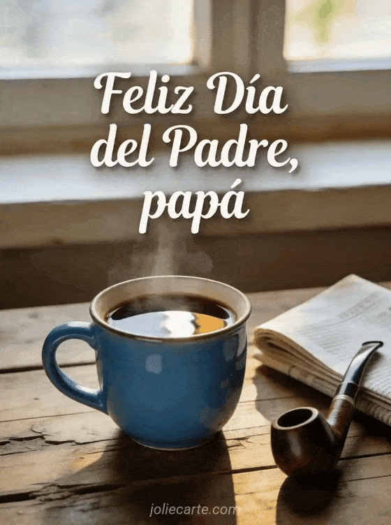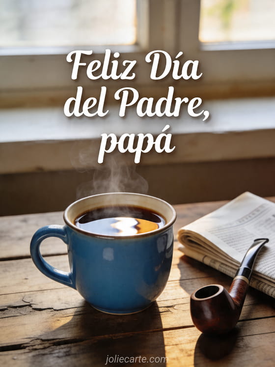 Compartan una imagen de feliz Día del Padre con una taza de café humeante, un periódico doblado y luz suave de la mañana sobre una mesa rústica de madera. También pueden descubrir una feliz día papá mamá, una imagen Día del Padre o una tarjeta camisa del Día del Padre.