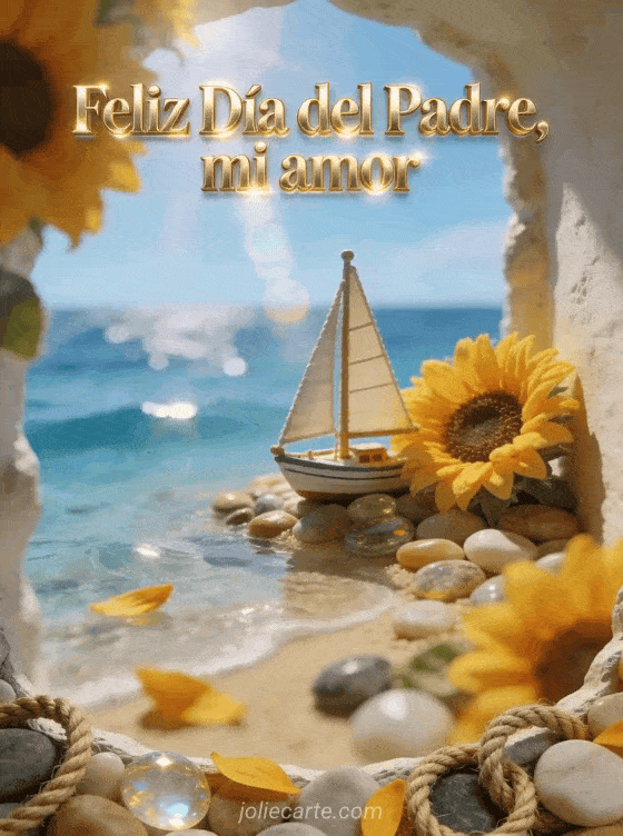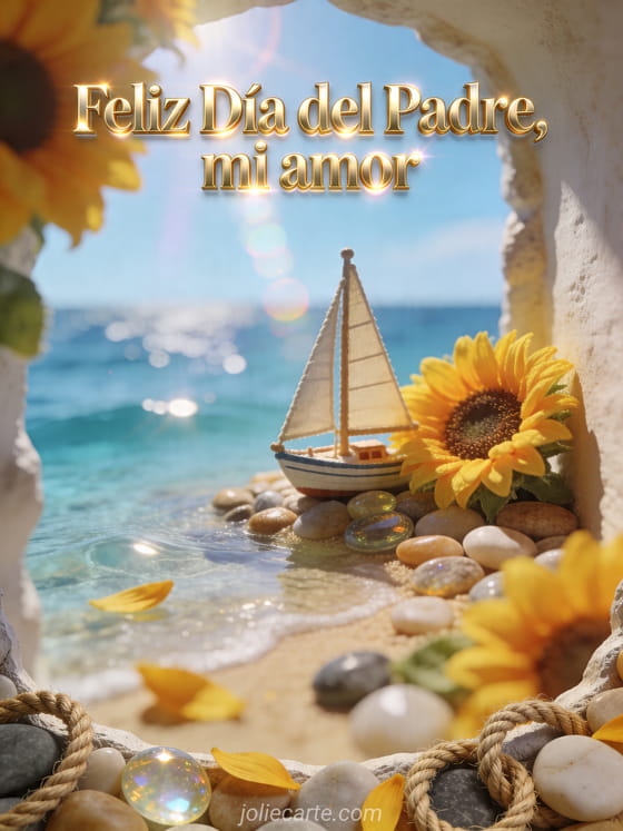 Envíen un saludo tierno de feliz Día del Padre mi amor con un velero en miniatura en una cala soleada, girasoles frescos, guijarros pulidos y colores vivos del mar. Vean también un modelo de tarjeta para Día del Padre, feliz día papá mi amor o palabras tiernas del Día del Padre.