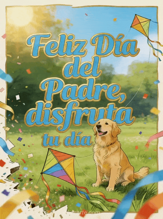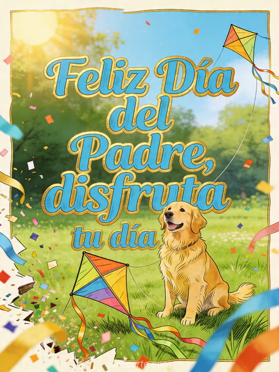 Envía una tarjeta de feliz Día del Padre mi hijo con letras azul cielo enérgicas, una ilustración alegre en tinta de un golden retriever junto a una cometa colorida en una pradera soleada, hierba verde, cintas y confeti. Descubre también amor Día del Padre texto amor, dibujo día del padre o una tarjeta papá.