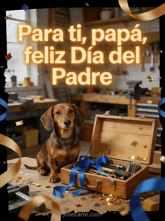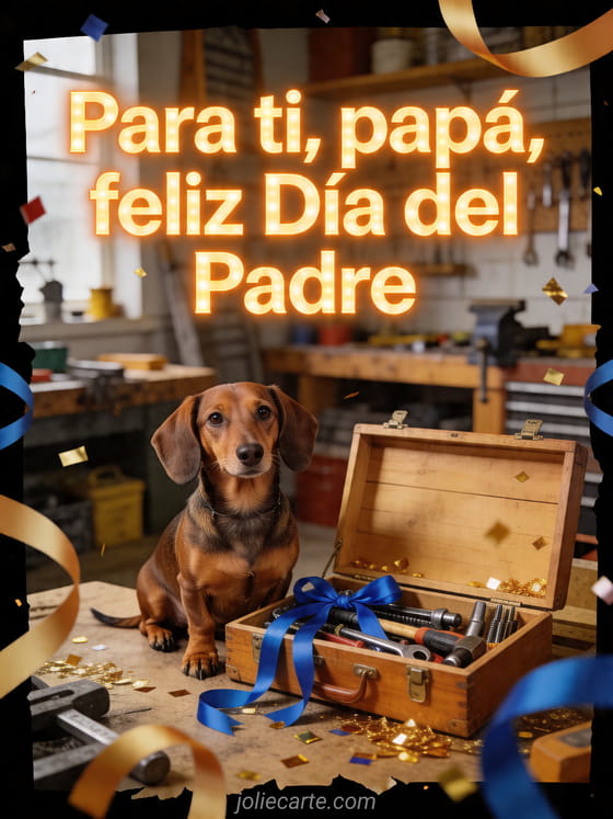 Envíen una imagen cálida de feliz Día del Padre papá con un perro salchicha fotorrealista junto a una caja de herramientas abierta con herramientas pulidas, cintas azules, confeti dorado y una escena luminosa de taller. Vean también feliz Día del Padre mi hijo, amor Día del Padre texto amor o dibujo día del padre.