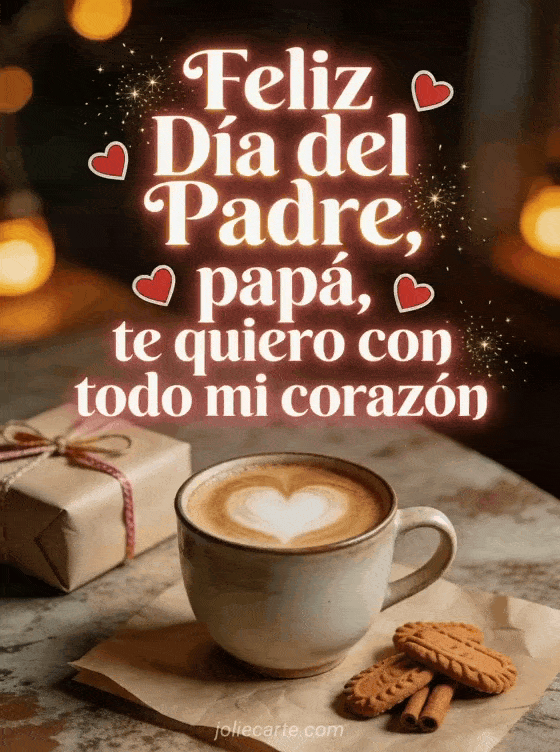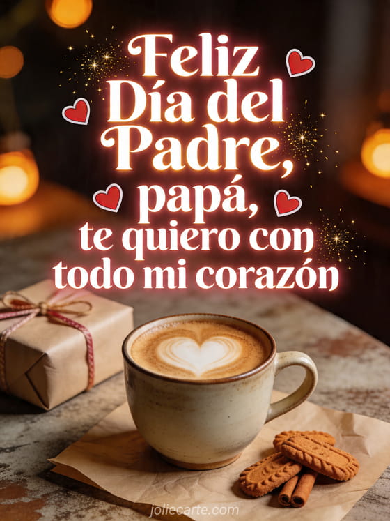 Dile a papá cuánto lo quieres con una tarjeta acogedora que muestra café, arte latte en forma de corazón, un regalo y galletas de canela. También pueden enviar feliz Día del Padre, flores día del padre o una feliz Día del Padre imagen.