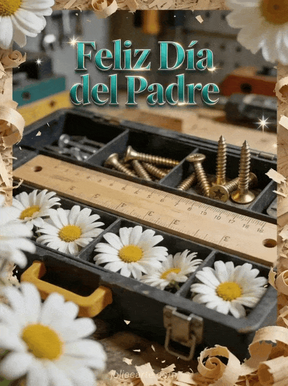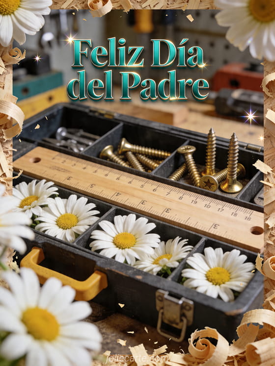 Envíen un saludo orgulloso de feliz Día del Padre con una escena fotorrealista de caja de herramientas, una regla de madera pulida, tornillos de latón y margaritas frescas bajo luz clara de taller. Vean también texto Día del Padre, un modelo tarjeta Día del Padre o feliz día del papá.