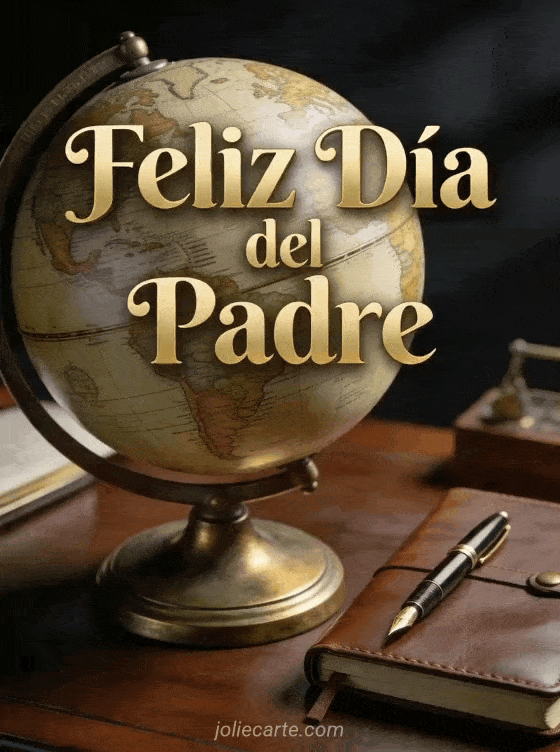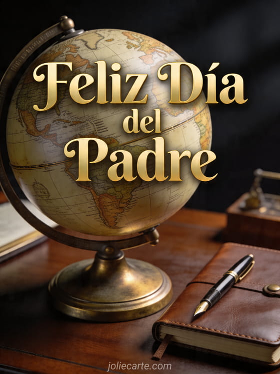 Envíen un saludo elegante de feliz Día del Padre con un antiguo globo terráqueo de latón sobre un escritorio de caoba, junto a una pluma fuente y un cuaderno de cuero. También pueden descubrir flores día del padre, una feliz Día del Padre imagen o feliz día papá mamá.