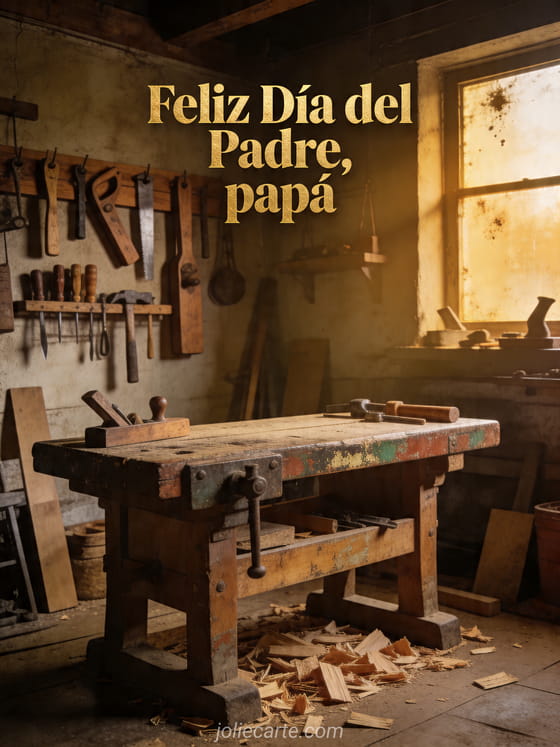 Envíen un saludo cálido de feliz día del papá con tipografía vintage dorada, un taller artesanal, herramientas de madera en la pared, un banco gastado y virutas en el suelo. También pueden descubrir una imagen feliz Día del Padre, feliz día del padre a todos los papás del mundo o un amor poema de amor para el Día del Padre.