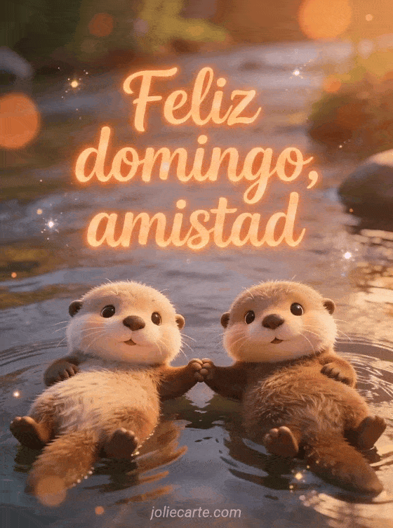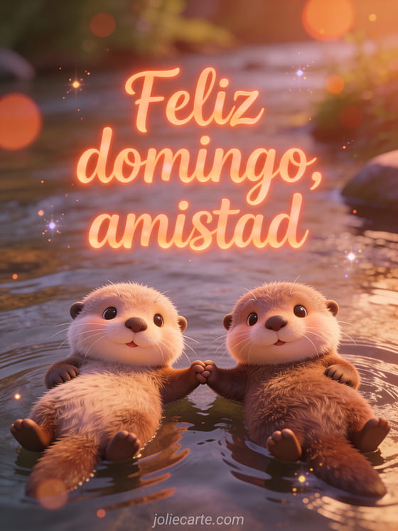 Comparte feliz domingo amistad con letras terracota cálidas, dos lindas nutrias de caricatura tomadas de la mano mientras flotan boca arriba, un entorno de río y expresiones adorables. Descubre también feliz domingo en el Señor o feliz domingo gif animado brillante.