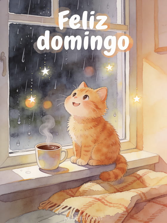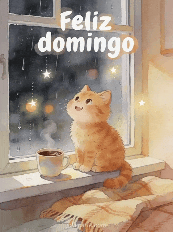 Comparte un feliz domingo con un gato naranja travieso, una bebida caliente y una ventana lluviosa muy acogedora. Descubran también un pequeño mensaje feliz domingo, una imagen para desear un feliz domingo o una feliz domingo tarjetas gratis.