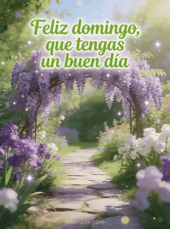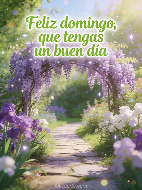 Compartan un hermoso saludo de domingo con un jardín de primavera, un arco de glicina en flor, camino de piedra, flores moradas y blancas, y una atmósfera encantadora. También pueden enviar gracioso feliz domingo gif o feliz domingo por la noche.