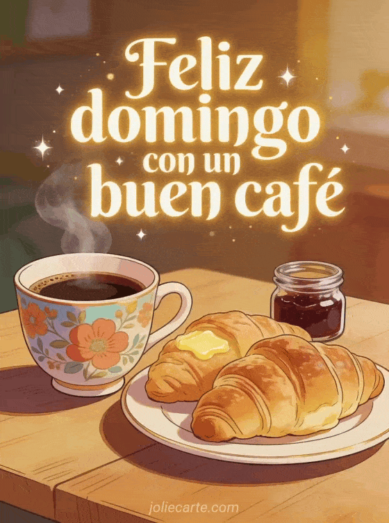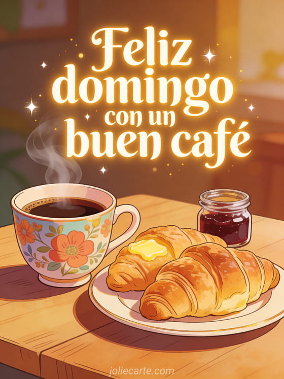 Envía un saludo cálido de feliz domingo con letras color castaño, una taza de café humeante, hojaldres, un tarrito de mermelada, tonos dorados de mañana y acentos brillantes. También pueden ver este feliz domingo gato humor, esta feliz domingo mi amiga o este feliz domingo gif divertido.