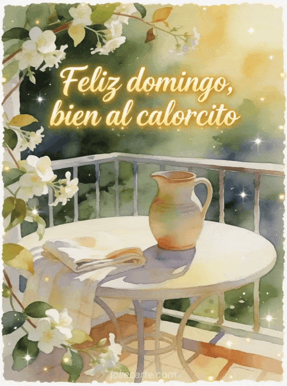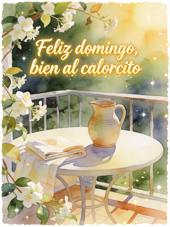 Envíen una imagen de feliz domingo cálido con letras color miel, jazmín y una terraza iluminada por el sol. Descubran también una feliz domingo imagen gif, un feliz domingo texto o una feliz domingo perros imagen.
