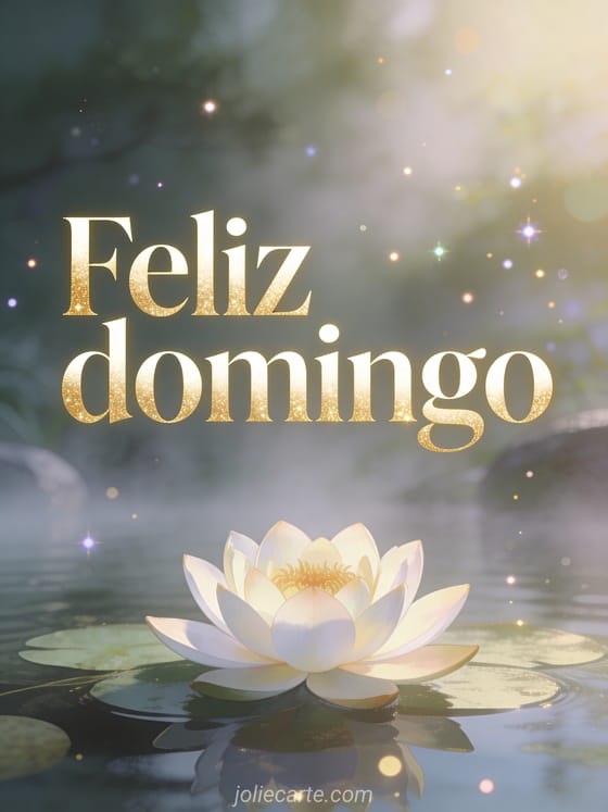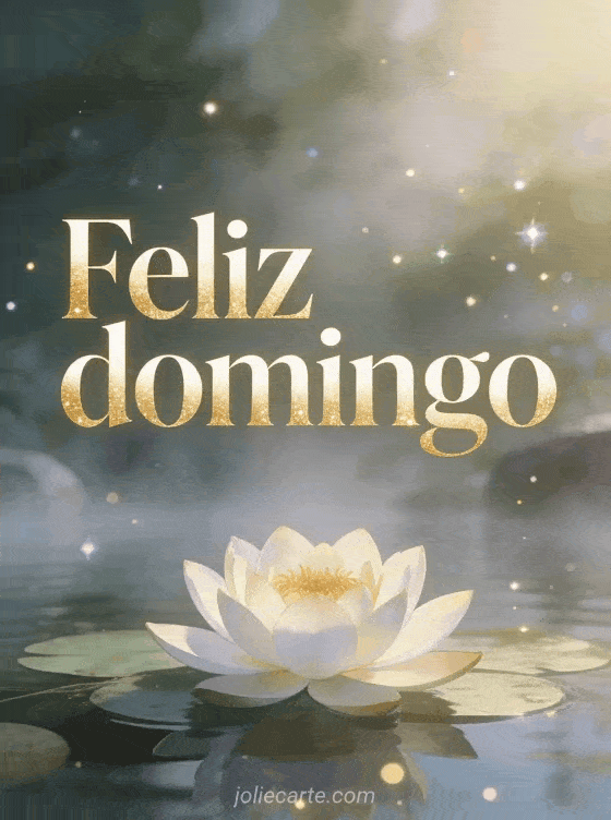 Comparte una cita de feliz domingo con letras inspiradoras, brillo dorado sutil, una hermosa flor de loto flotando sobre agua tranquila, niebla de mañana y un ambiente espiritual de jardín zen. Descubre también feliz domingo amistad gif o feliz domingo imágenes gif animado.