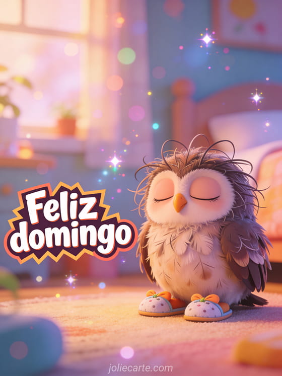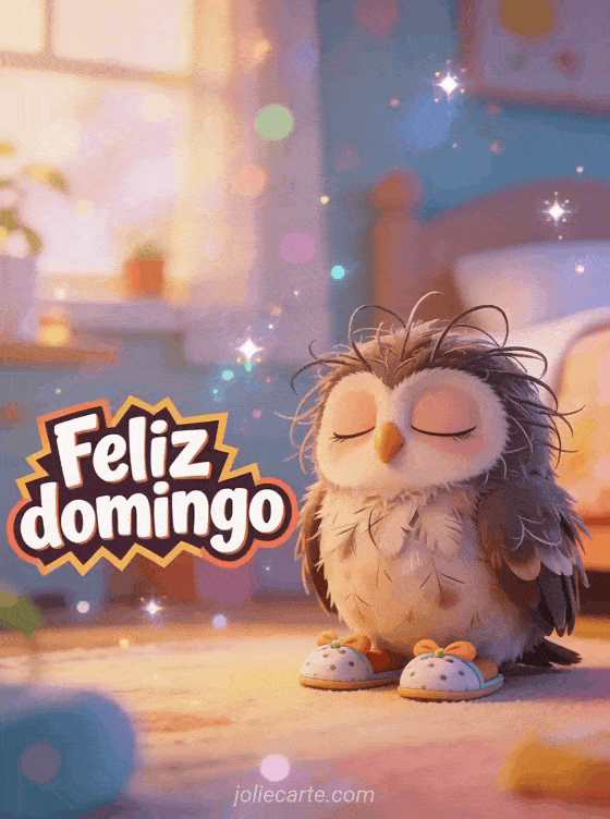 Envíen un saludo ligero de feliz domingo con letras caricaturescas y un búho dormilón con plumas desordenadas usando pantuflas pequeñas. Descubran también buenos días feliz domingo gif, buenos días feliz domingo tarjeta o feliz domingo soleado besos.
