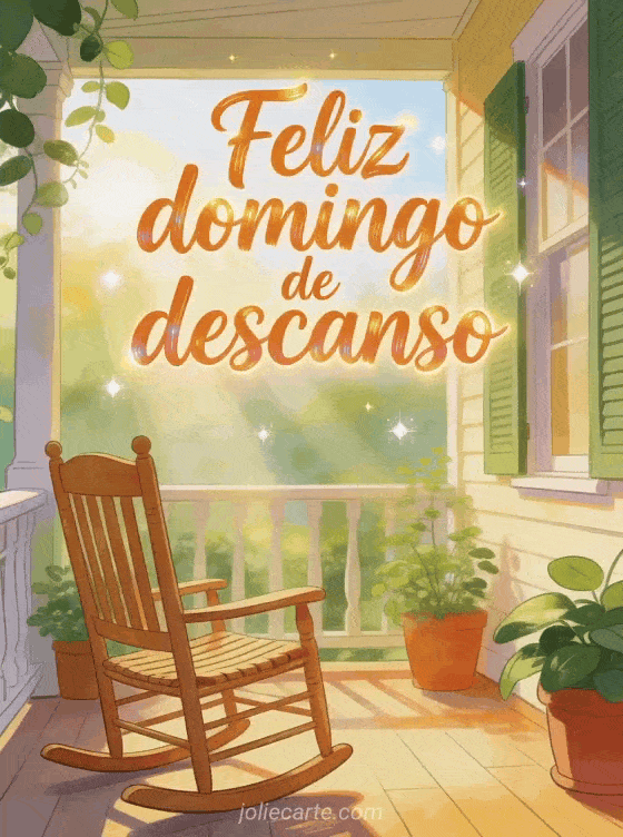 Envíen un saludo de feliz domingo de descanso con una mecedora vacía en una veranda, plantas en macetas y rayos suaves de sol de mañana. Descubran también feliz domingo cita, feliz domingo amistad gif o feliz domingo imágenes gif animado.