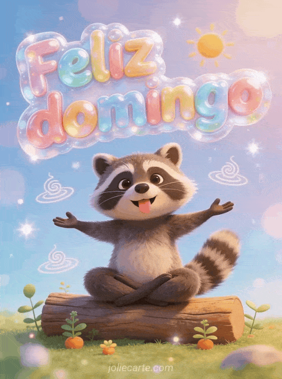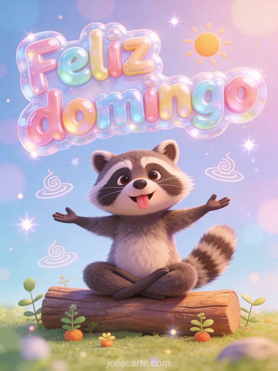 Envíen un saludo divertido de feliz domingo con letras burbuja saltarinas y un mapache chistoso haciendo posturas de yoga en un tronco dentro de una escena absurda de bienestar. Descubran también desear un feliz domingo, feliz domingo de junio o feliz domingo amistad imágenes.