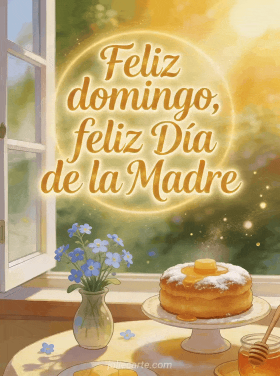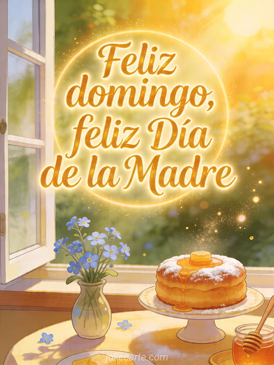 Comparte una tarjeta luminosa para el domingo de Día de la Madre, con escritura dorada miel, una ventana abierta, nomeolvides, pastel de miel y luz dorada. Descubre también tarjetas virtuales gratuitas del Día de las Madres, un mensaje para el Día de la Madre o mensajes para el Día de la Madre.