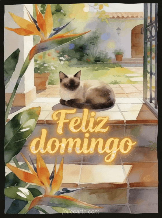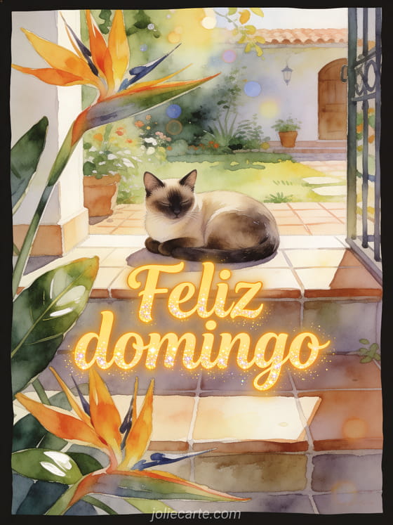 Comparte un feliz domingo con un gato siamés acurrucado en un escalón de jardín, rodeado de aves del paraíso y luz cálida de acuarela. Envía este detalle y descubre también feliz domingo tarjeta gratis, imágenes de feliz domingo o imagen animada de feliz domingo.
