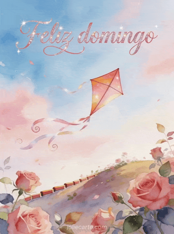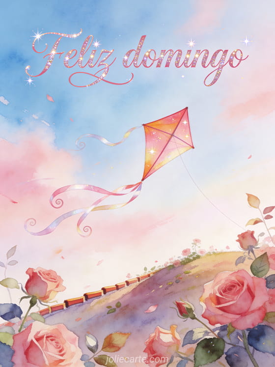 Desea un feliz domingo alegre con una cometa brillante sobre una colina, cintas en el cielo y rosas antiguas que cruzan el borde. Descubre también imágenes animadas para desear un feliz domingo, una feliz domingo cálido imagen o una feliz domingo imagen gif.