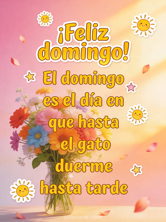 Comparte una broma alegre de feliz domingo con letras soleadas, estrellas juguetonas, un ramo de flores coloridas y pétalos flotando en luz cálida de la tarde. Descubran también feliz domingo imágenes gratis, una bonita imagen buenos días domingo o feliz domingo muchos besos gif.