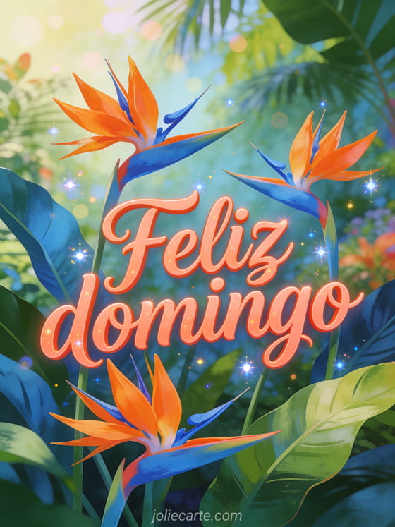 Comparte feliz domingo imágenes gratis con letras coral vibrantes, hermosas flores tropicales ave del paraíso, follaje verde abundante y colores naranja y azul intensos en un jardín exótico. Descubre también bonita imagen buenos días domingo o feliz domingo muchos besos gif.