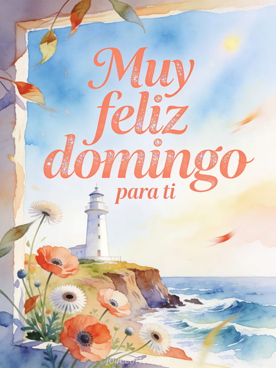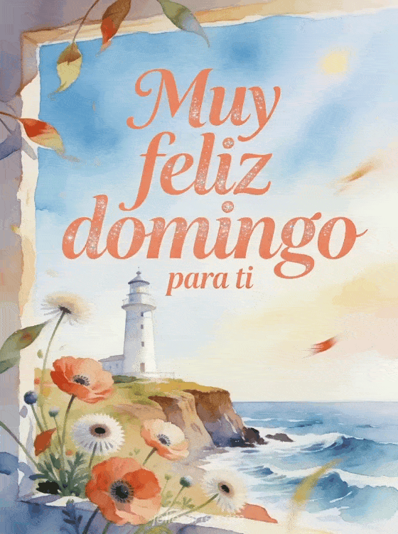 Comparte un muy feliz domingo con un faro blanco sobre un acantilado luminoso junto al mar, olas abajo, anémonas y hojas movidas por el viento. Descubre también feliz domingo gif animado gif animado brillante, una feliz domingo imagen bonita gratis o un lindo texto feliz domingo.