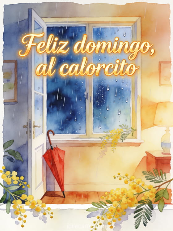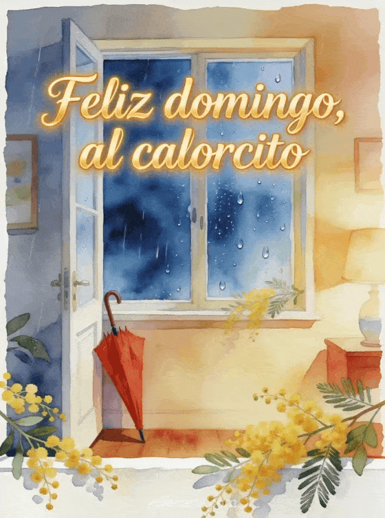 Comparte un mensaje acogedor de domingo con letra ámbar, una vista cálida de ventana con lluvia afuera, un paraguas rojo junto a la puerta y ramas de mimosa que cruzan el borde. También pueden enviar un feliz domingo besos gif animado, mensajes de feliz domingo o una café feliz domingo amistad imagen.