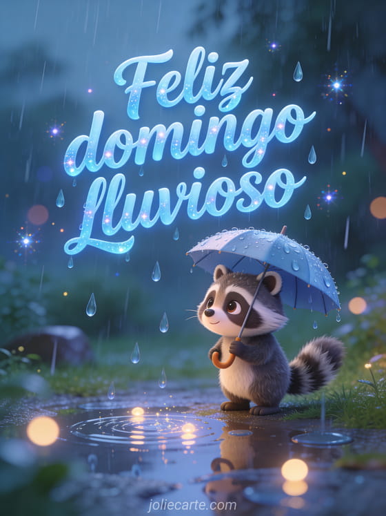 Comparte feliz domingo lluvioso con letras azules suaves, efecto de gotas, un lindo mapache de caricatura con un paraguas pequeño y charcos que reflejan luces suaves. Descubre también feliz domingo gifs animados o buenos días domingo tarjeta.