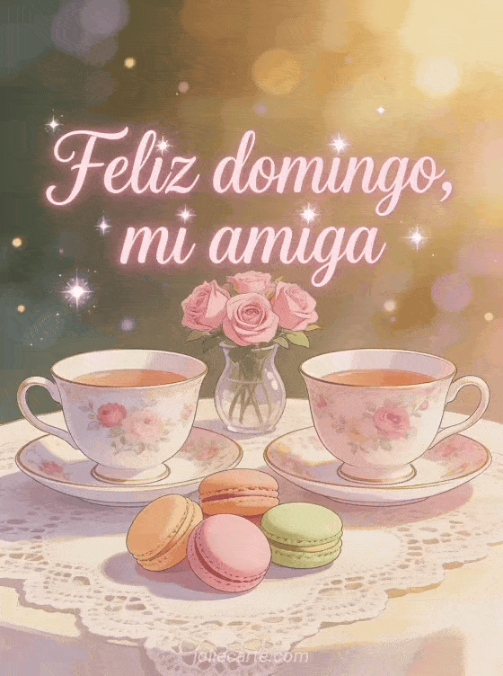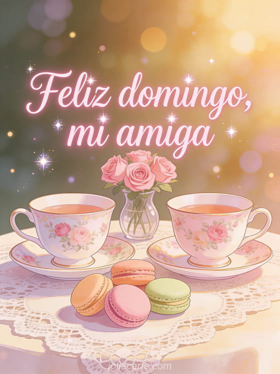 Comparte feliz domingo mi amiga con letras rosas cálidas, una elegante mesa de té de la tarde para dos, tazas bonitas, macarons, flores frescas y un ambiente suave de amistad. Descubre también feliz domingo gif divertido o bonita tarjeta virtual feliz domingo.