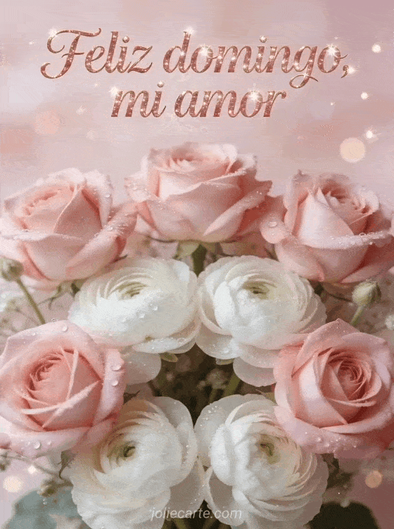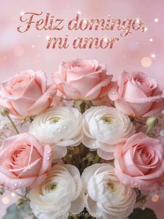 Comparte feliz domingo mi amor con letras oro rosado, un hermoso arreglo de rosas rosadas y ranúnculos blancos, delicado rocío de mañana y un ambiente elegante en tonos rosa suave. Descubre también buen final de domingo o buen día domingo.