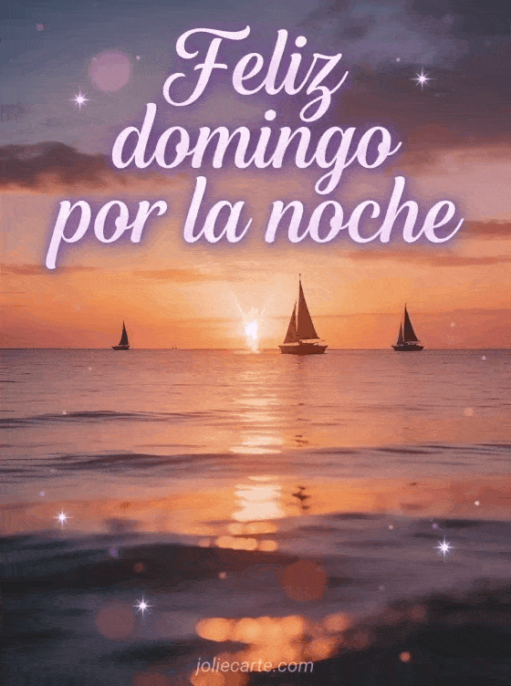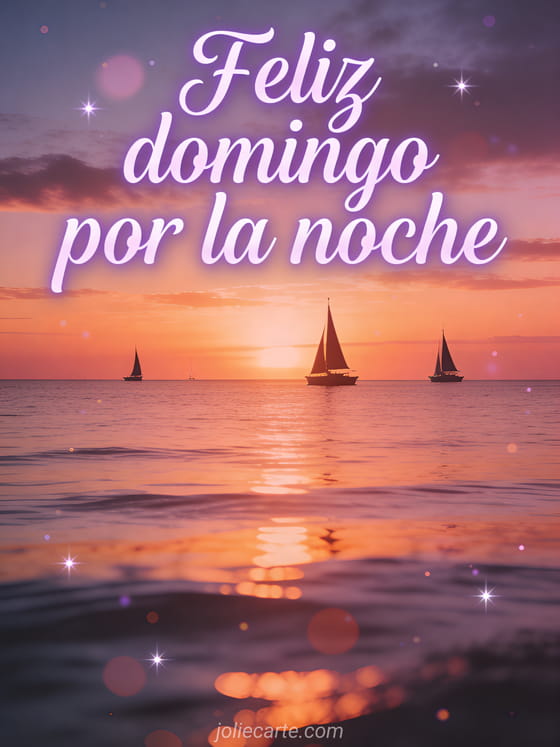 Envíen un saludo suave de feliz domingo por la noche con letras moradas, un atardecer apacible sobre un mar en calma y siluetas de veleros. Descubran también feliz domingo amistad, feliz domingo en el Señor o feliz domingo gif animado brillante.