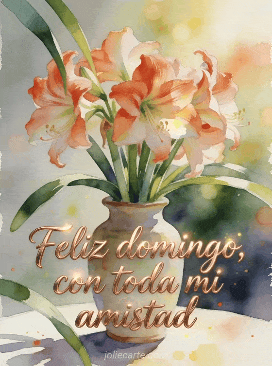 Comparte una tarjeta cálida de feliz domingo con un ramo generoso de flores de amarilis en un jarrón de cerámica sobre una mesa iluminada por el sol. También puedes enviar feliz domingo soleado gifs, una feliz domingo gris imagen o un feliz domingo mujer gif.
