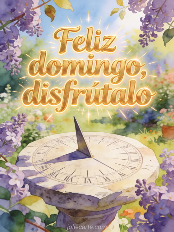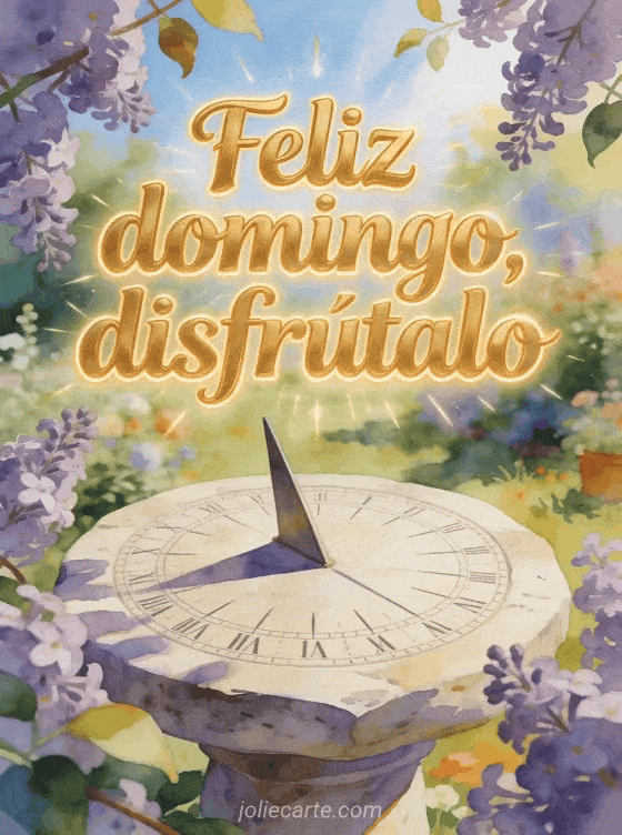 Envíen feliz domingo soleado gifs con letra dorada, un reloj de sol de piedra en un jardín florido y ramas de lila bajo un sol claro. Descubran también una feliz domingo gris imagen, un feliz domingo mujer gif o feliz domingo gifs gratis.