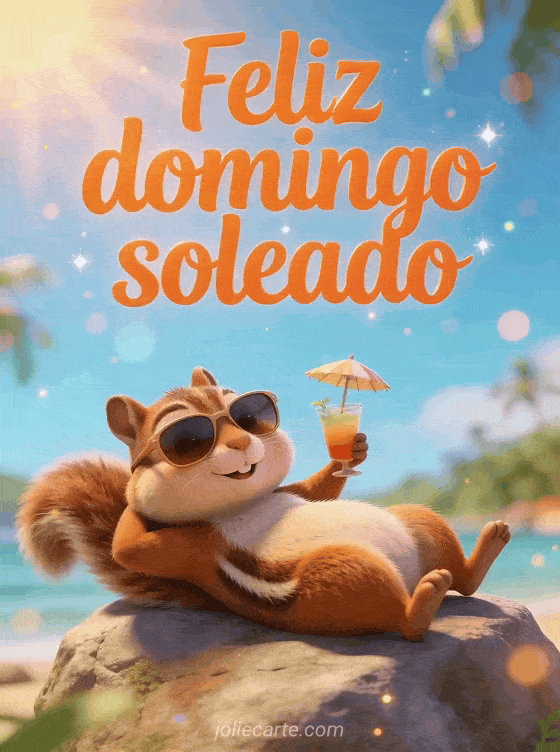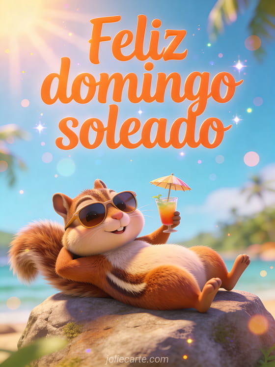 Comparte una imagen de feliz domingo soleado con letras naranja brillantes, una ardilla de caricatura tomando sol sobre una roca, gafas de sol, una bebida pequeña con sombrilla y ambiente de vacaciones de verano. Descubre también mensaje de feliz domingo para una amiga o feliz domingo tarjeta gif.