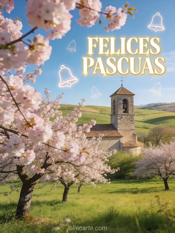 Un hermoso paisaje primaveral con cerezos en flor y campanas de Pascua volando sobre la campiña francesa — la tarjeta perfecta para celebrar la Pascua. Descubre también un modelo de tarjeta de Pascua, una tarjeta de conejo de pascua o Felices Pascuas imágenes.