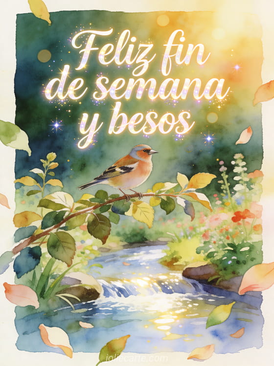 Comparte un saludo ligero de fin de semana con letras en acuarela, luz dorada de jardín y besos cariñosos. Descubre también imágenes de feliz fin de semana besos, buen fin de semana primavera o cita de buen fin de semana.
