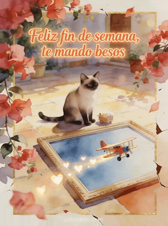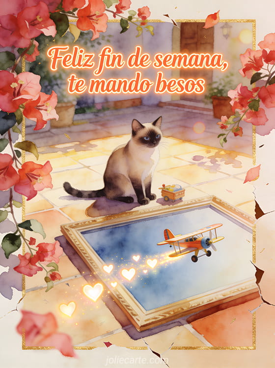Envía un feliz fin de semana lleno de besos con una escena realista en acuarela donde la buganvilla cae alrededor de un gato siamés y un avión de juguete deja corazones luminosos. También pueden compartir hola feliz fin de semana besitos, feliz fin de semana a todos besos o muchos besos y feliz fin de semana.