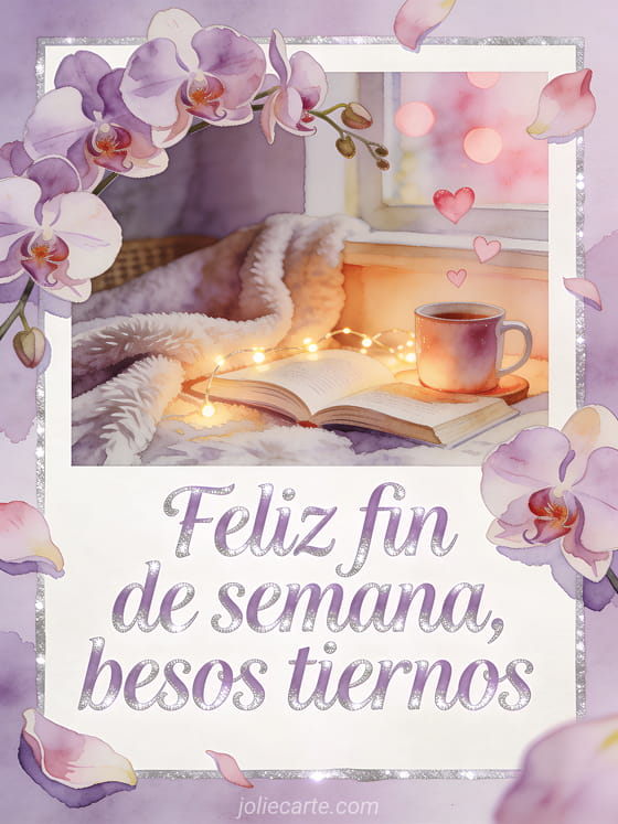 Comparte una imagen gif de feliz fin de semana con besos, letras lavanda, pétalos de orquídea, un rincón de lectura acogedor, manta suave, taza cálida, luces de hadas y corazones. También puedes enviar feliz fin de semana y besos, lindo fin de semana muchos besos o besos fin de semana.