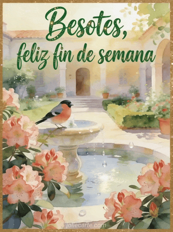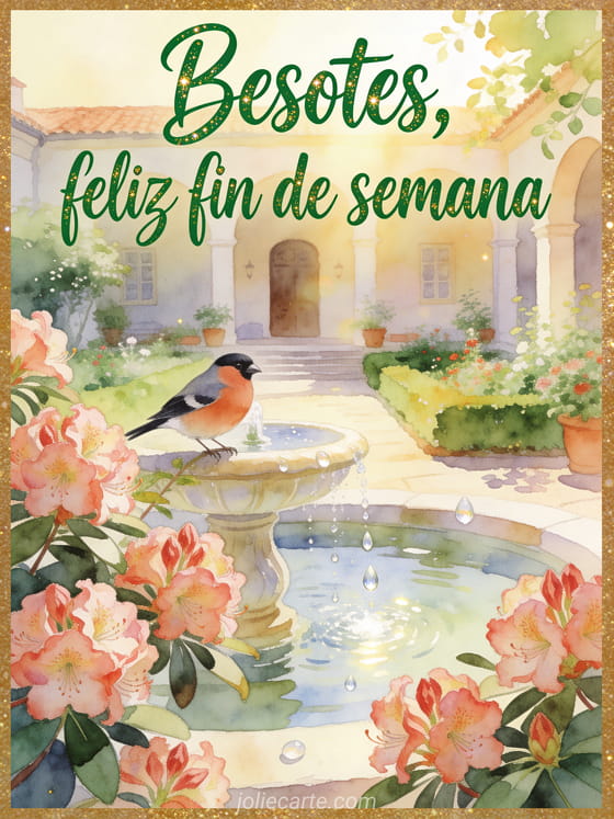 Envía besotes para el fin de semana con una tarjeta en acuarela donde los rododendros, un camachuelo y una fuente crean una escena tierna de patio soleado. También pueden compartir buen fin de semana divertido humor, enviar buen fin de semana para ustedes o elegir una tarjeta buen fin de semana humor.