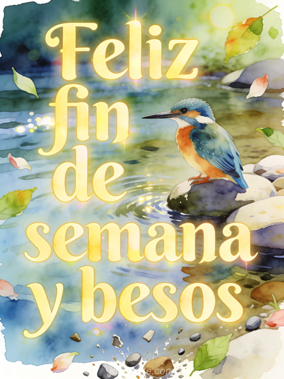 Comparte un deseo luminoso de fin de semana con letras en acuarela, un martín pescador junto a un río claro, piedras suaves y hojas frescas. Descubre también una tarjeta de besitos de fin de semana, una tarjeta de buen fin de semana besos imagen o una tarjeta de feliz fin de semana besos animados.