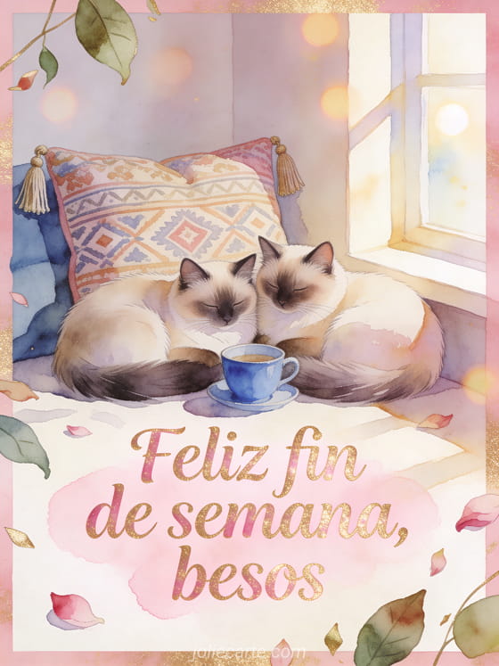 Envía un saludo acogedor de feliz fin de semana con dos gatos birmanos, una taza azul y encanto de acuarela. Descubran también una imágenes de feliz fin de semana besos, una buen fin de semana primavera o una feliz fin de semana besitos gif.