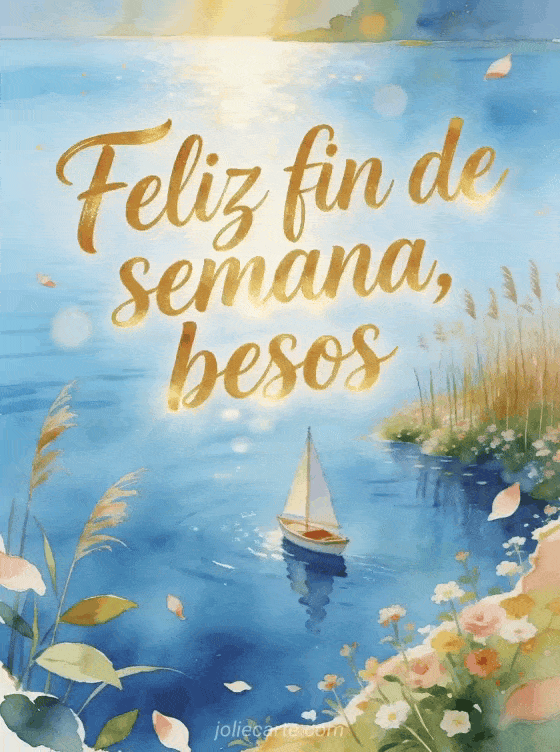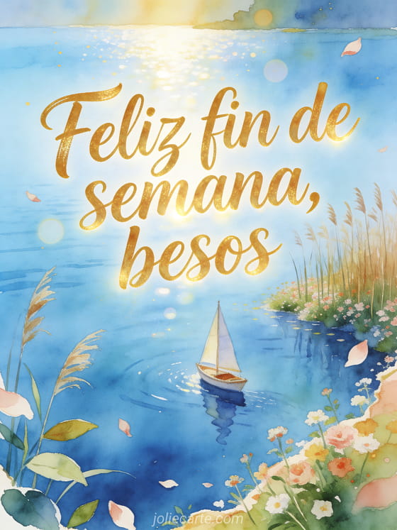 Envía una tarjeta relajante de fin de semana con letras ligeras en acuarela, un pequeño velero en un lago azul brillante, juncos y orillas con flores silvestres para una escapada apacible. Descubre también una beso grande buen fin de semana besos, una gif feliz fin de semana muchos besos o una feliz fin de semana mariposa besos.