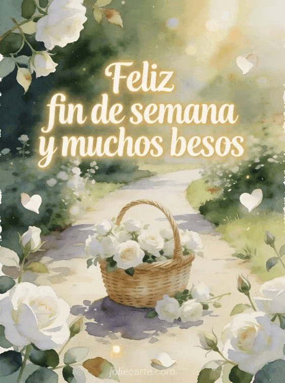 Envía una tierna tarjeta con rosas blancas alrededor de una cesta de mimbre en un sendero soleado y pétalos en forma de corazón. Descubran también unos besos y feliz fin de semana, una besos buen fin de semana imagen o besos último fin de semana del año.