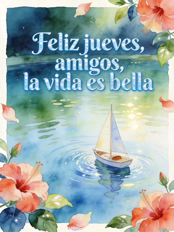 Comparte un saludo amigable de jueves con letras azul océano, reflejos nacarados, un pequeño velero en un lago brillante, flores de hibisco, hojas lustrosas, ondas soleadas y brillo suave. También pueden enviar un feliz jueves imagen gif, una feliz jueves imagen brillante o un buenos días feliz jueves gif animado.