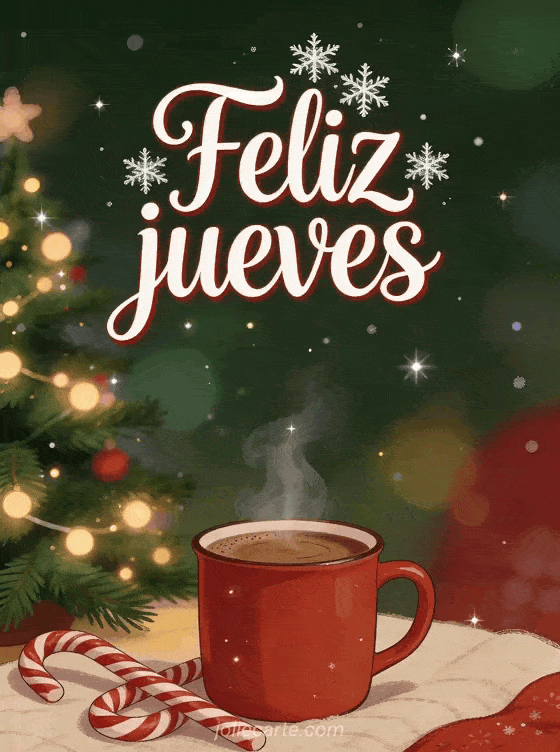 Envíen un saludo mágico de feliz jueves con letras festivas, chocolate caliente, bastones de caramelo y un árbol de Navidad decorado con luces brillantes. Descubran también feliz jueves bajo la lluvia gif, feliz jueves imágenes gratis o buenos días feliz jueves imagen.