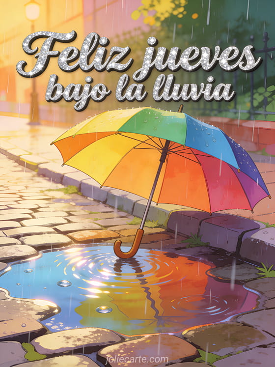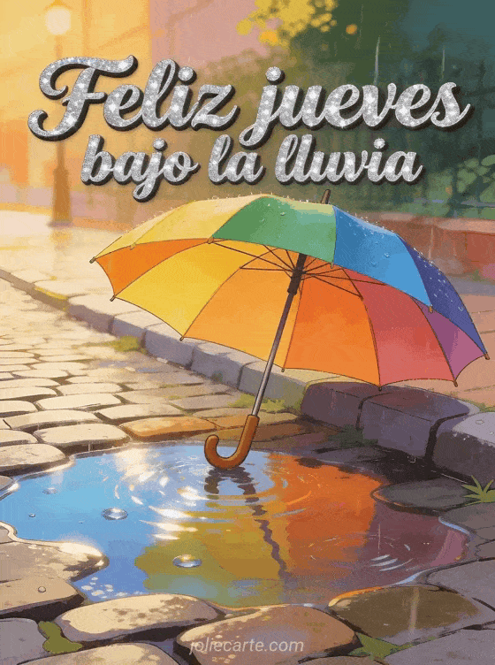 Comparte feliz jueves bajo la lluvia con cursiva marcada, brillo plateado, un paraguas colorido junto a charcos relucientes, adoquines lluviosos y luz cálida. Descubre también feliz jueves imágenes gratis, buenos días feliz jueves imagen o buenos días feliz jueves besos imágenes.