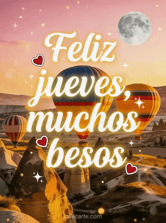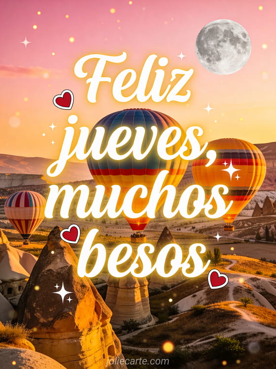 Envía feliz jueves besos gifs animados con letras cursivas blancas luminosas, halos dorados, corazones rojos y globos aerostáticos coloridos al amanecer en Capadocia. Comparte un deseo romántico entre semana y descubre también feliz jueves tarjeta bonita, feliz jueves gif o feliz jueves lluvioso gif.
