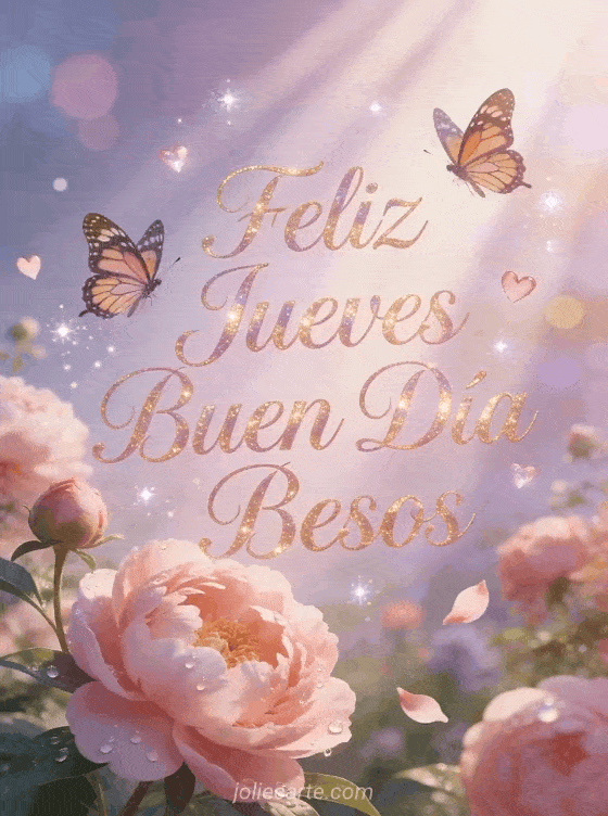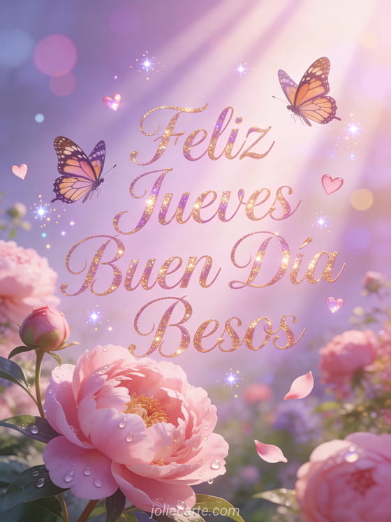 Desee un feliz jueves buen día con besos con esta romántica tarjeta virtual. Dos elegantes mariposas monarca danzan alrededor de peonías rosas en flor con corazoncitos flotando como destellos mágicos. Descubra también una tarjeta de buenos días del jueves, una tarjeta de jueves buen día o una tarjeta de buen jueves.