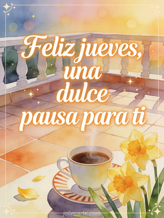 Comparte una dulce pausa de jueves con una taza de café humeante en una terraza de baldosas, narcisos brillantes y colores cálidos de amanecer. También pueden compartir feliz jueves amigos imagen, feliz jueves por la mañana imágenes o buenos días jueves cita.