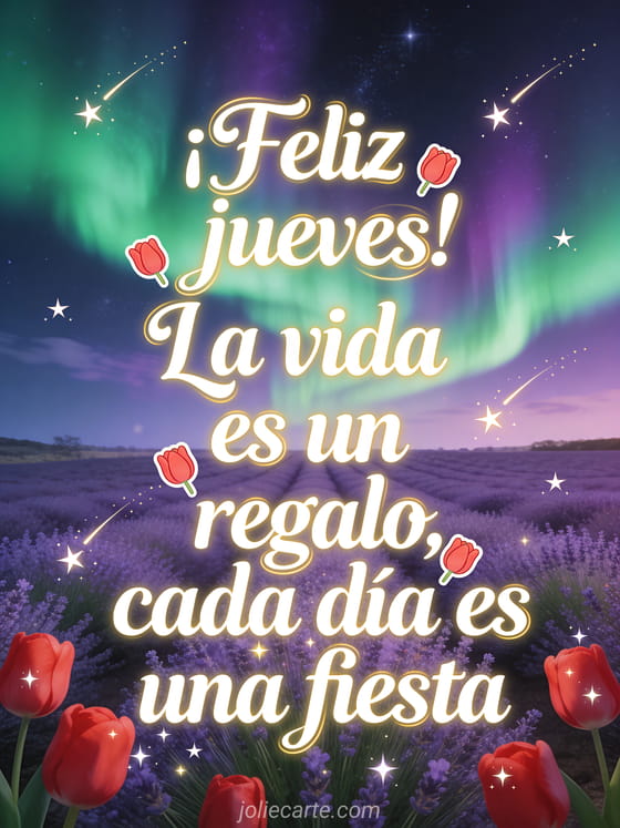 Comparte una cita inspiradora de feliz jueves con letras cursivas blancas, tulipanes rojos, estrellas fugaces y un paisaje de lavanda en Provenza bajo una aurora boreal verde y violeta. También pueden ver esta buen día de jueves, esta buenos días es jueves en imagen o esta feliz jueves besos imagen.