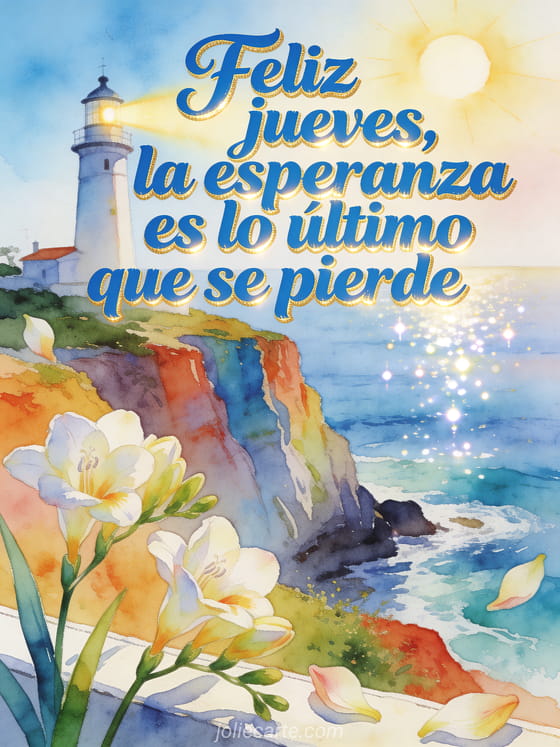 Comparte una tarjeta inspiradora de feliz jueves con cita, un faro soleado, un acantilado junto al mar y fresias luminosas en primer plano. Descubre también un feliz jueves gato gif, una imagen para desear feliz jueves o una feliz jueves café imagen.
