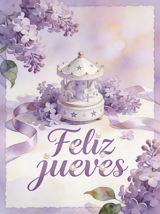 Desea feliz jueves con una caja de música de porcelana, patrones de estrellas, flores de lila y cintas de satén en luz pastel de acuarela. También pueden enviar feliz jueves lluvia, feliz jueves imágenes de flores o imágenes de buenos días de jueves.